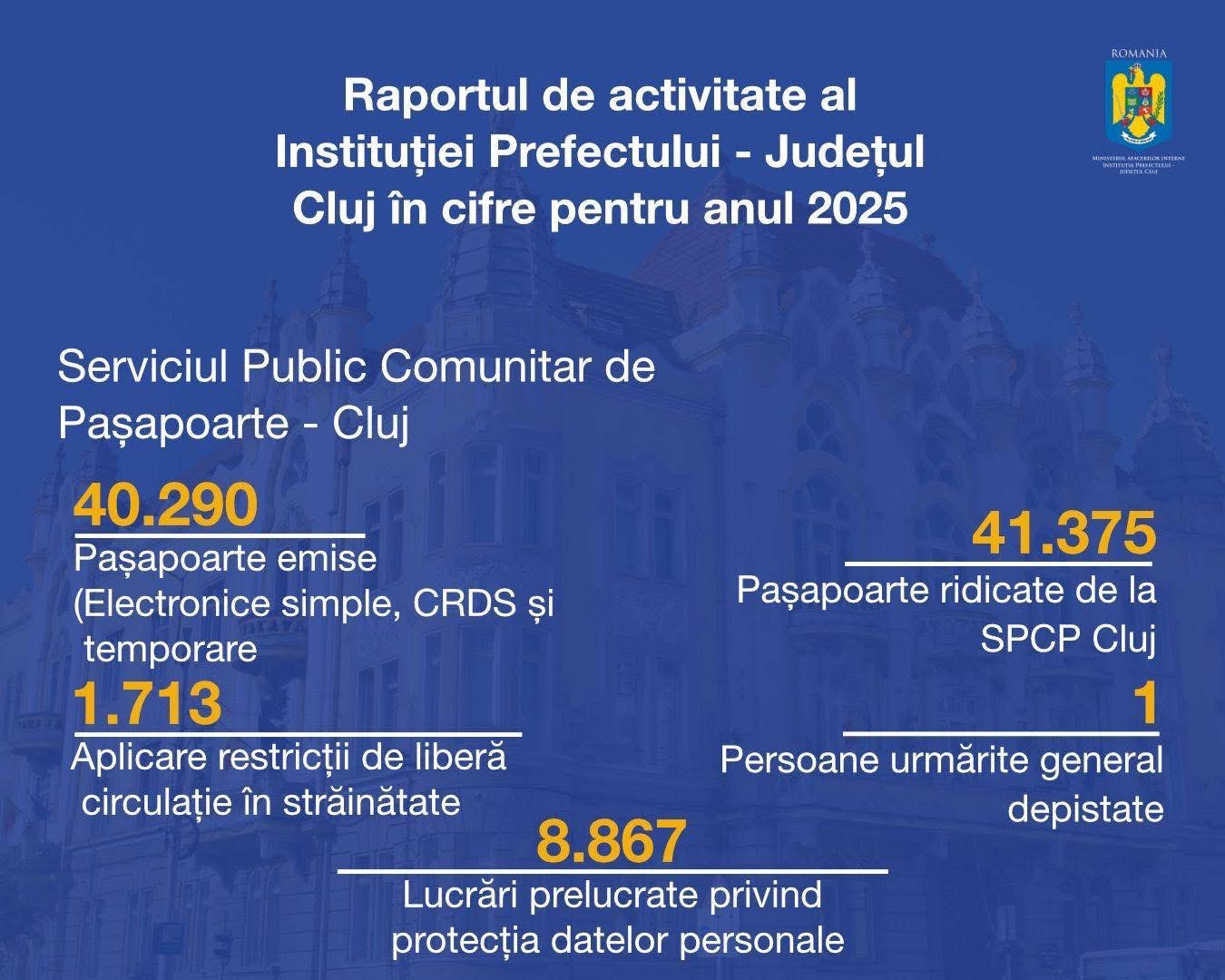 Instituția Prefectului – Județul Cluj prezintă bilanțul activității Serviciului Public Comunitar de Pașapoarte Cluj pentru anul 2025, evidențiind volumul ridicat de solicitări și eficiența serviciilor oferite cetățenilor.