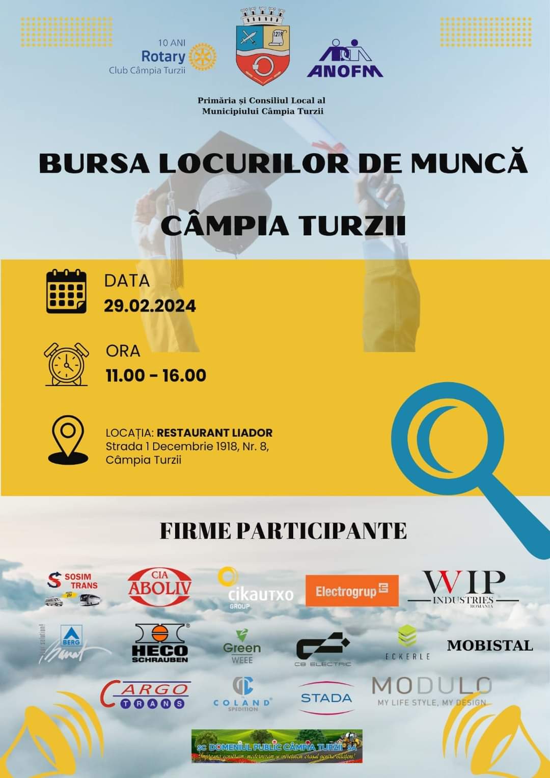 Primăria Municipiului Câmpia Turzii organizează, la inițiativa domnului primar, Dorin Nicolae LOJIGAN, joi, 29 februarie 2024, în intervalul orar 11:00 – 16:00, Bursa Locurilor de Muncă. Evenimentul se va desfășura la Sala de Evenimente a Hotelului Liador din Câmpia Turzii și va reuni un număr semnificativ de angajatori din Câmpia Turzii și împrejurimi.