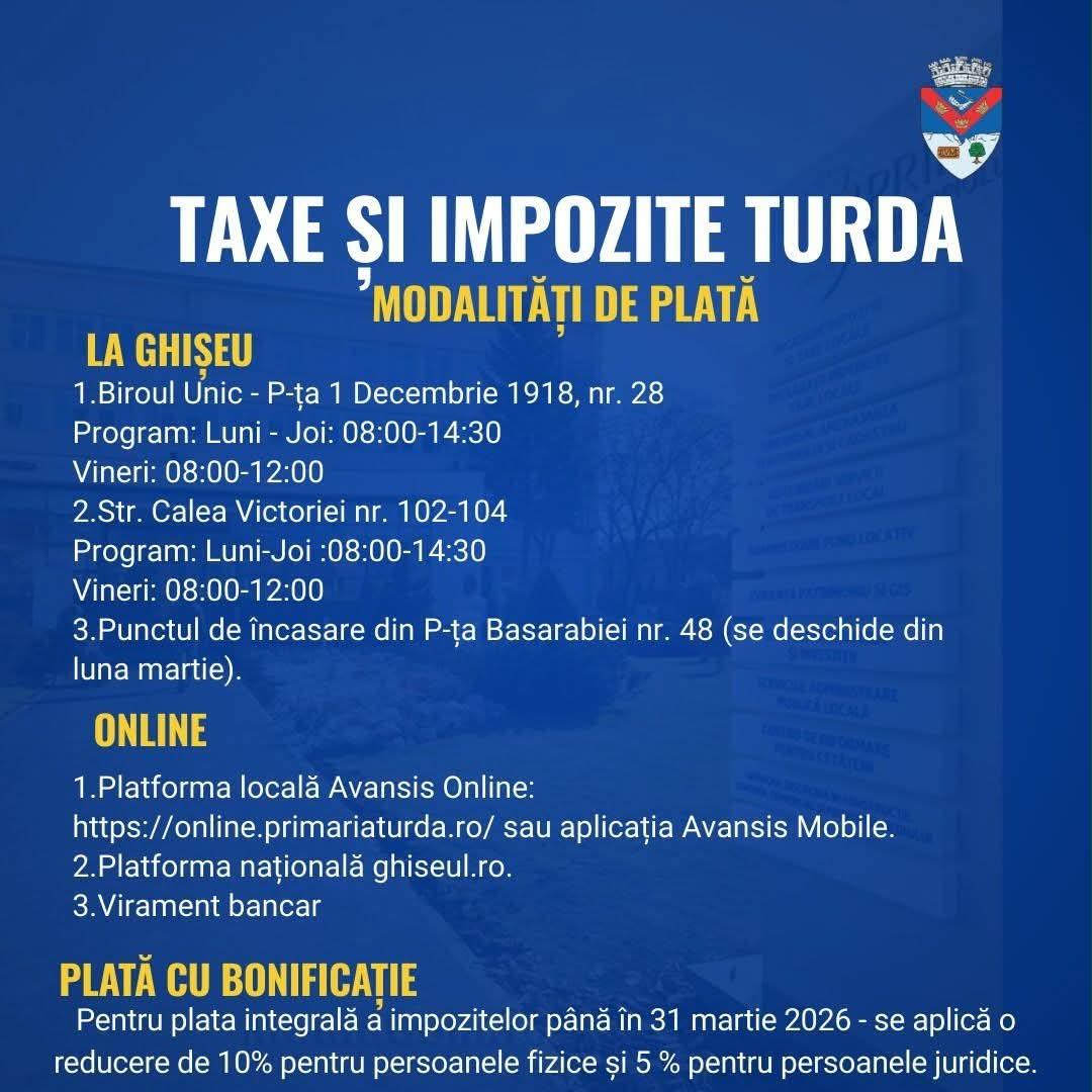 Impozitele și taxele locale, precum și ratele și chiriile pot fi achitate la ghișeele Primăriei Municipiului Turda sau prin intermediul platformelor online puse la dispoziția contribuabililor.