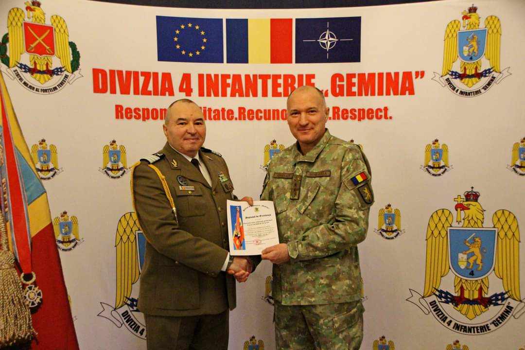 Astăzi, 28 decembrie, la sediul comandamentul Diviziei 4 Infanterie ,,Gemina”, s-a desfășurat, în prezența comandantului Diviziei 4 Infanterie ,,Gemina”, generalul maior Bogdan Cernat și a întregului personal al structurii, ceremonia de trecere în rezervă a locotenent-colonelului Dănuț-Ovidel Capră, maistrului militar principal Petru Frunzeti, maistrului militar Florin Ciprian Berindei, plutonierului adjutant principal Viorel Someșfălean și a plutonierului adjutant Alexandru Martin.