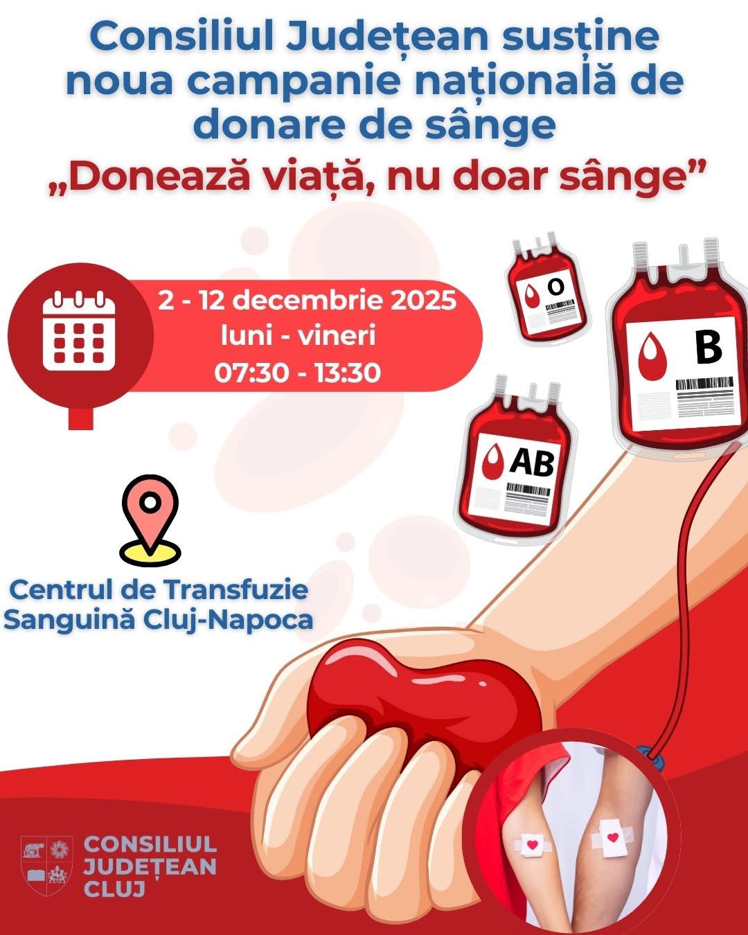 Acțiunile de donare de sânge continuă ➡️ până în data de 12 decembrie 2025 și au loc de luni până vineri, în intervalul orar 07:30 – 13:30, la ➡️ Centrul de Transfuzie Sanguină din Cluj-Napoca, situat pe strada Nicolae Bălcescu la nr. 18.