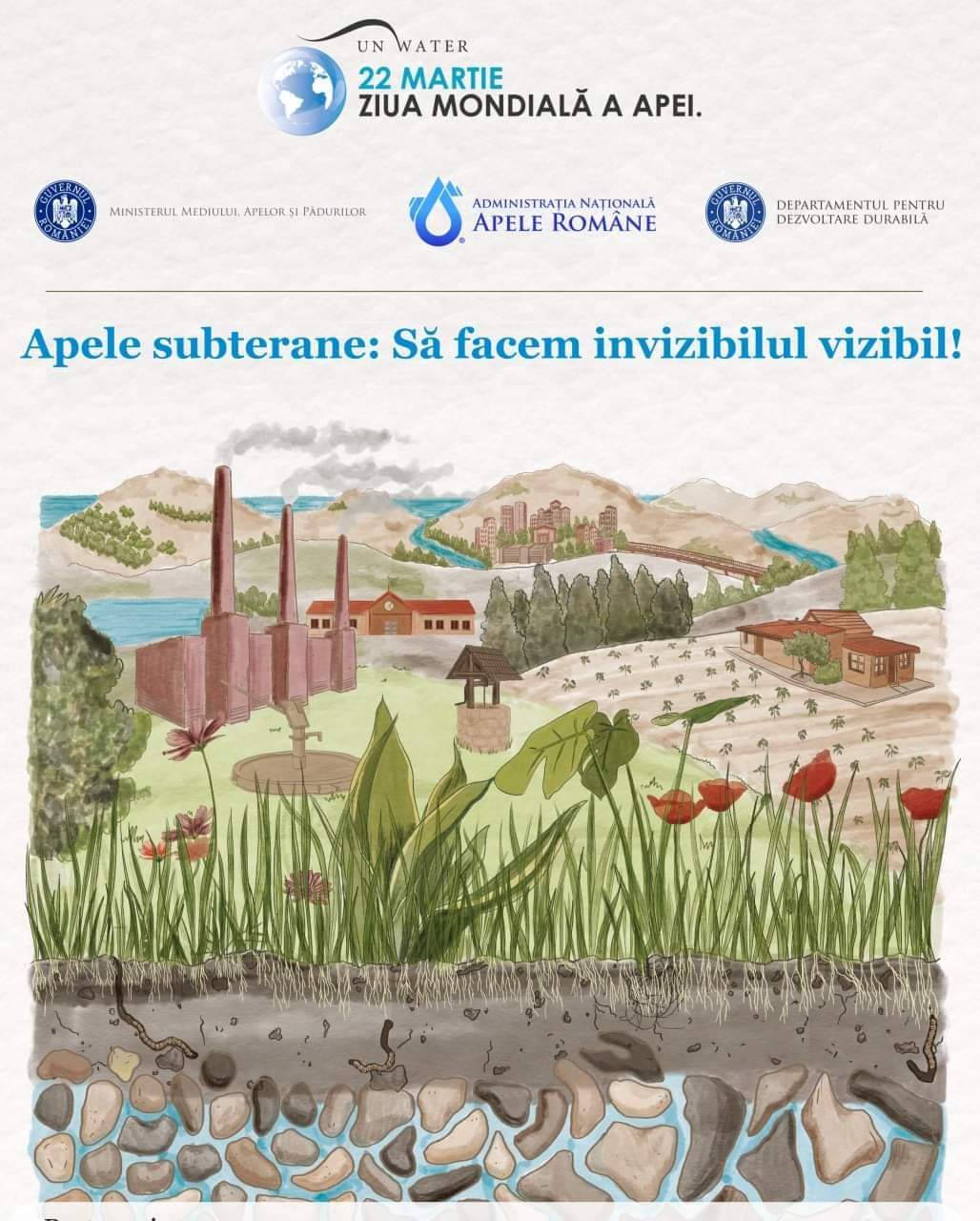 Tema de anul acesta a Zilei Mondiale a Apei este “𝘼𝙥𝙖 𝙨𝙪𝙗𝙩𝙚𝙧𝙖𝙣𝙖 – 𝙁𝙖𝙘𝙖𝙣𝙙 𝙞𝙣𝙫𝙞𝙯𝙞𝙗𝙞𝙡𝙪𝙡, 𝙫𝙞𝙯𝙞𝙗𝙞𝙡”, cu referire la faptul că apa din sursele subterane, deși este invizibilă, constituie o resursă naturală care trebuie protejată și gestionată cu grijă, în perspectiva unei dezvoltări sustenabile.