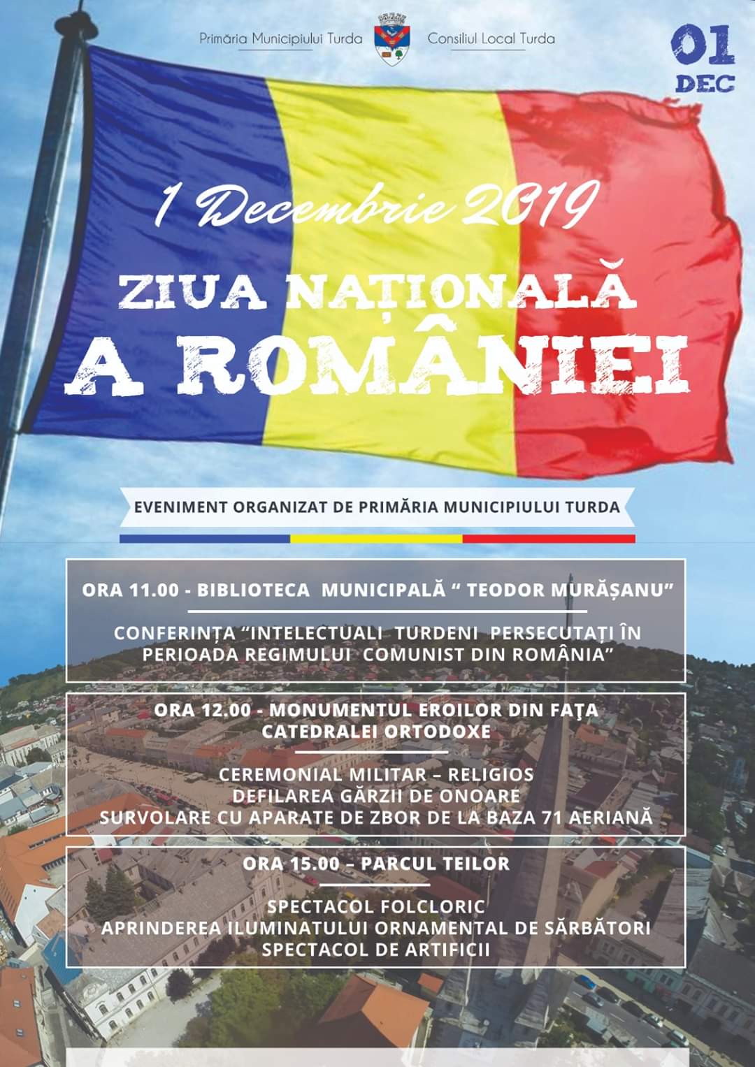 Primăria Turda a pregătit un program special pentru data de 1 Decembrie, de Ziua Națională a României. În prima parte a zilei vom participa la ceremonialul militar – religios la Monumentul Eroilor, iar după-masă, în Parcul Teilor, va avea loc un spectacol folcloric, vom aprinde iluminatul ornamental de sărbători și vom privi împreună focurile de artificii.