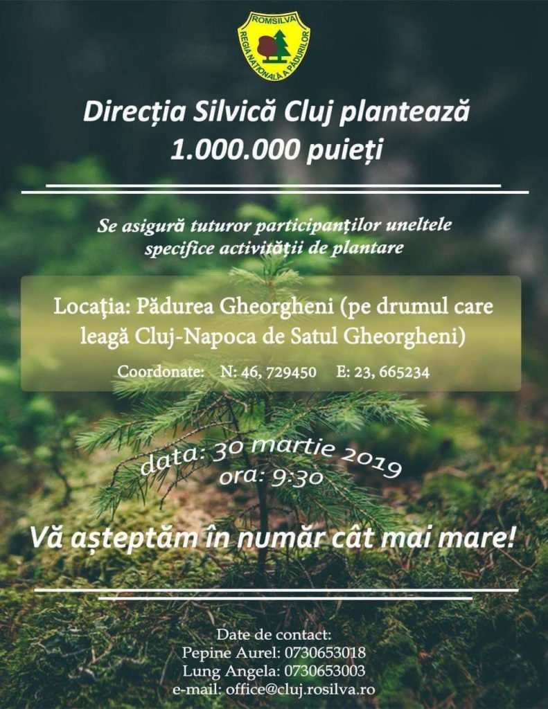Vă invităm să vă alăturați acțiunii noastre de împădurire din data de 30 martie 2019 ora 09:30 in Padurea Gheorgheni, pe drumul care leaga Cluj-Napoca de Satul Gheorgheni. Punctul de intalnire va fii semnalizat cu pancarte si se afla la 200m de nodul centurii Apahida-Valcele cu strada Borhanci.