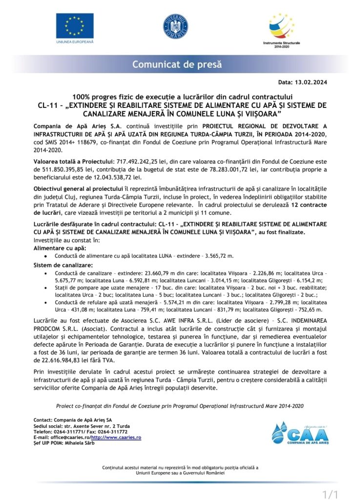 CL-11 – „EXTINDERE ȘI REABILITARE SISTEME DE ALIMENTARE CU APĂ ȘI SISTEME DE CANALIZARE MENAJERĂ ÎN COMUNELE LUNA ȘI VIIȘOARA”