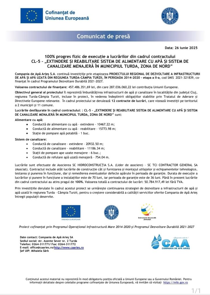 DE APĂ ȘI APĂ UZATĂ DIN REGIUNEA TURDA-CÂMPIA TURZII, ÎN PERIOADA 2014-2020 – etapa a II-a, cod SMIS 2021-321839, cofinanțat în cadrul Programului Dezvoltare Durabilă 2021-2027.