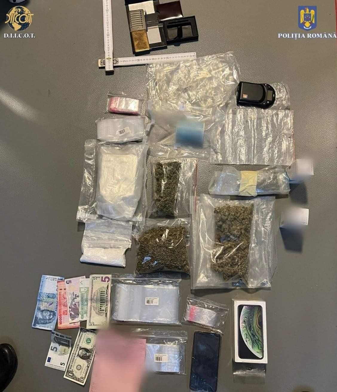 În urma perchezițiilor domiciliare, au fost descoperite și ridicate aproximativ 16 kilograme de cannabis și 600 de grame de cocaină, 2 grindere, 85 de pungi cu urme de substanțe, 233 de pungi prevăzute cu ziplock goale, un kit, 14.200 de lei, 500 de euro și 400 de dolari.