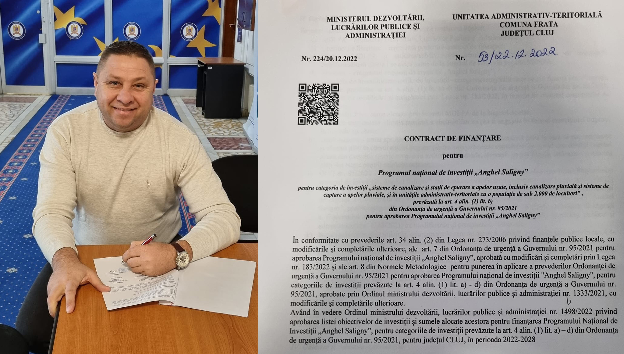 semnat contractul de finanțare prin programul Anghel Saligny în valoare de 18.200.000 lei pentru canalizare în Soporu de Câmpie. Anuțul a fost făcut cgiar de primarul comunei Frata, Cristian Cherecheș.