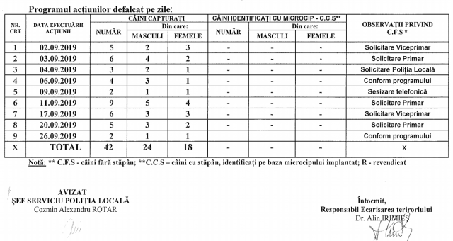 Acțiunile au constat în identificarea și strângerea câinilor fără stăpân, care circulau liber, fără însoțitor pe domeniul public al municipiului, capturându-se un număr de 42 caini, din care niciunul nu a fost identificat ca având microcip. Câinii au fost preluați cu proces verbal, în baza formularului individual de capturare, de către echipa de ecarisaj și transportați pentru aplicarea prevederilor legale în adăpostul propriu al prestatorului, amenajat în localitatea Turda, str. Bogata, jud, Cluj.