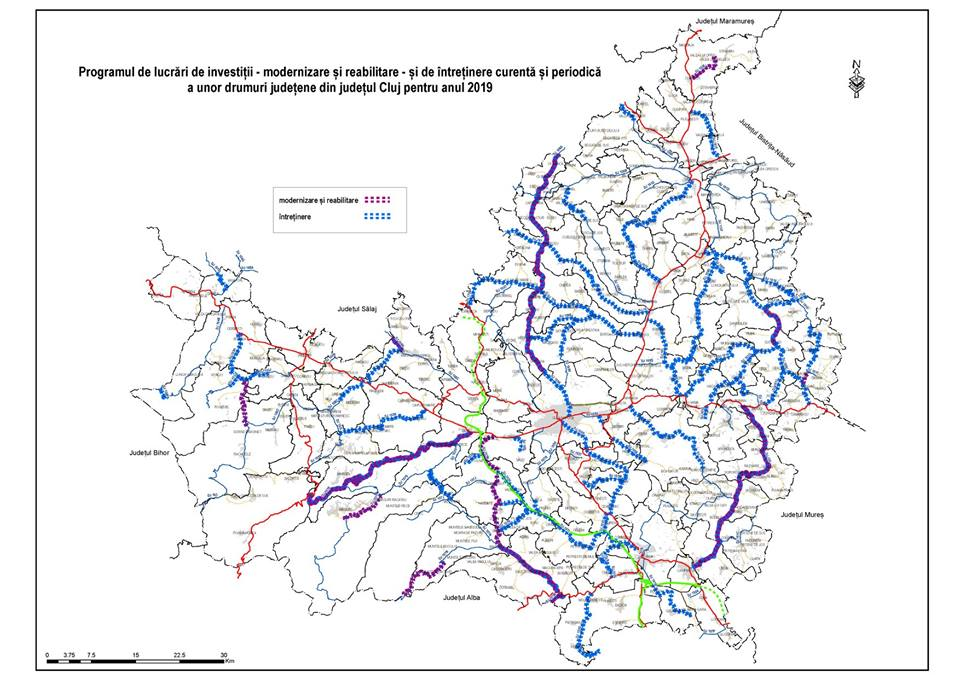 Astfel, 47 de drumuri județene clujene vor beneficia în anul 2019 de lucrări complexe de modernizare și reabilitare sau de lucrări de întreținere.