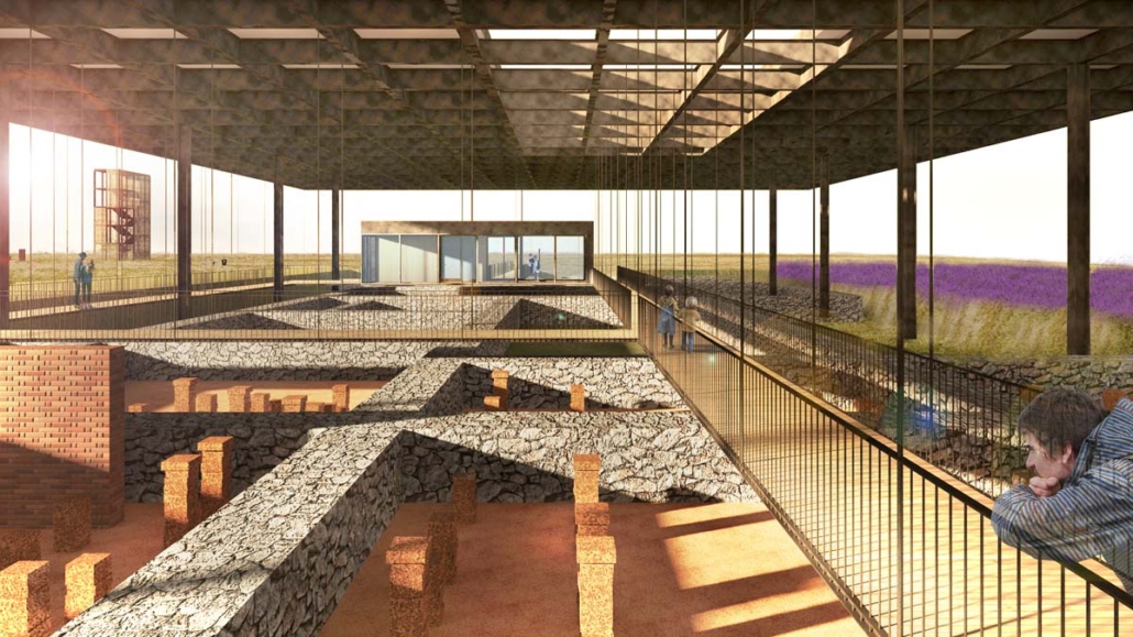 [b] Restaurarea ruinelor clădirii comandamentului, Principia, și punerea ei în valoare prin structura cu rol de sugerare a gabaritului și de remodelare a plasticii fațadelorPortalului de acces în clădirea comandamentului, Principia, denumită în continuare Obiectul 3;