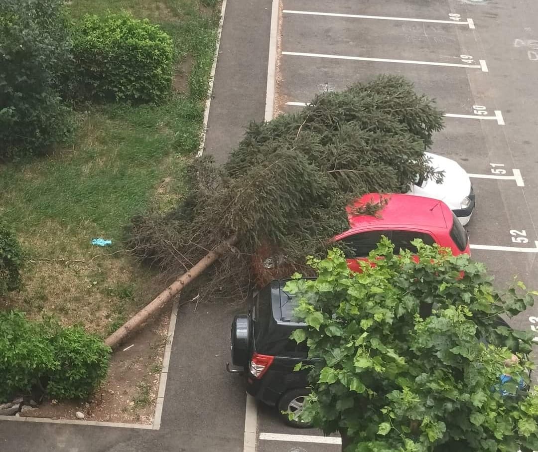 A fost Cod PORTOCALIU de furtună. La Turda un brad a căzut peste mașini.