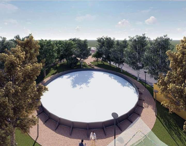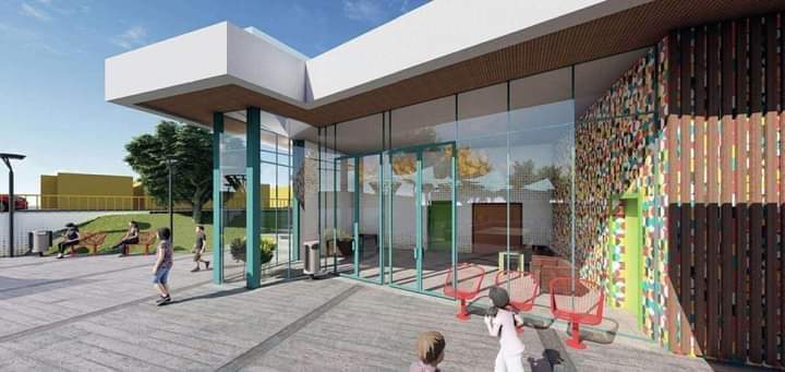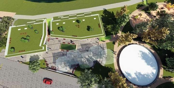 Piațetă cu pavilion și fântână – piațeta cu o suprafață amenajată de 666.00mp și pavilionul propuse în imediata vecinătate a clădirii multifuncționale se vor amenaja pentru a deservi zona de joacă interioară, spațiul de dimensiune generoasă relaționează direct cu interiorul clădirii, oferind posibilitatea utilizării lor împreună sau separat. Pavilionul urban a fost conceput atât pentru a oferi protecție suplimentară (umbră pe timpul verilor) cât și sub forma unei instalații arhitecturale contemporane care să aducă un plus de vitalitate spațiului urban.