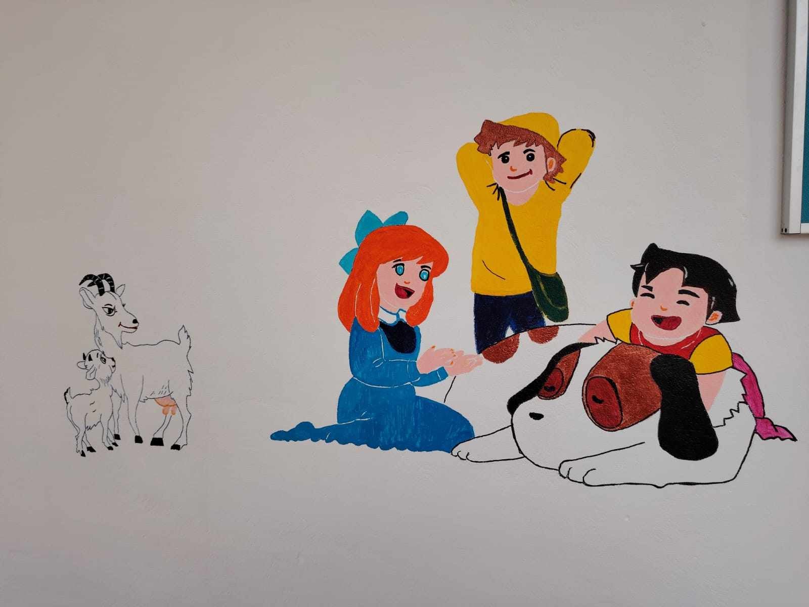 La etaj au fost pictaţi Harry Potter, Pippi Şoseţica, Shrek, Zeus, cei 2 poliţişti din Copăceni, pe Heidi, Clara, Peter, o căpriţă cu un iezişor şi câinele lor, un băiatul cu cărţi care scrie, Nică cocoţat într-un copac încercând să prindă pupăza, Shri Hanuman cu Lordul Rama din Ramayana, iar sala “Artă-Sport” găzduieşte 3 sportivi (un fotbalist, o karatistă şi un baschetbalist), un pictor şi un creion personificat.