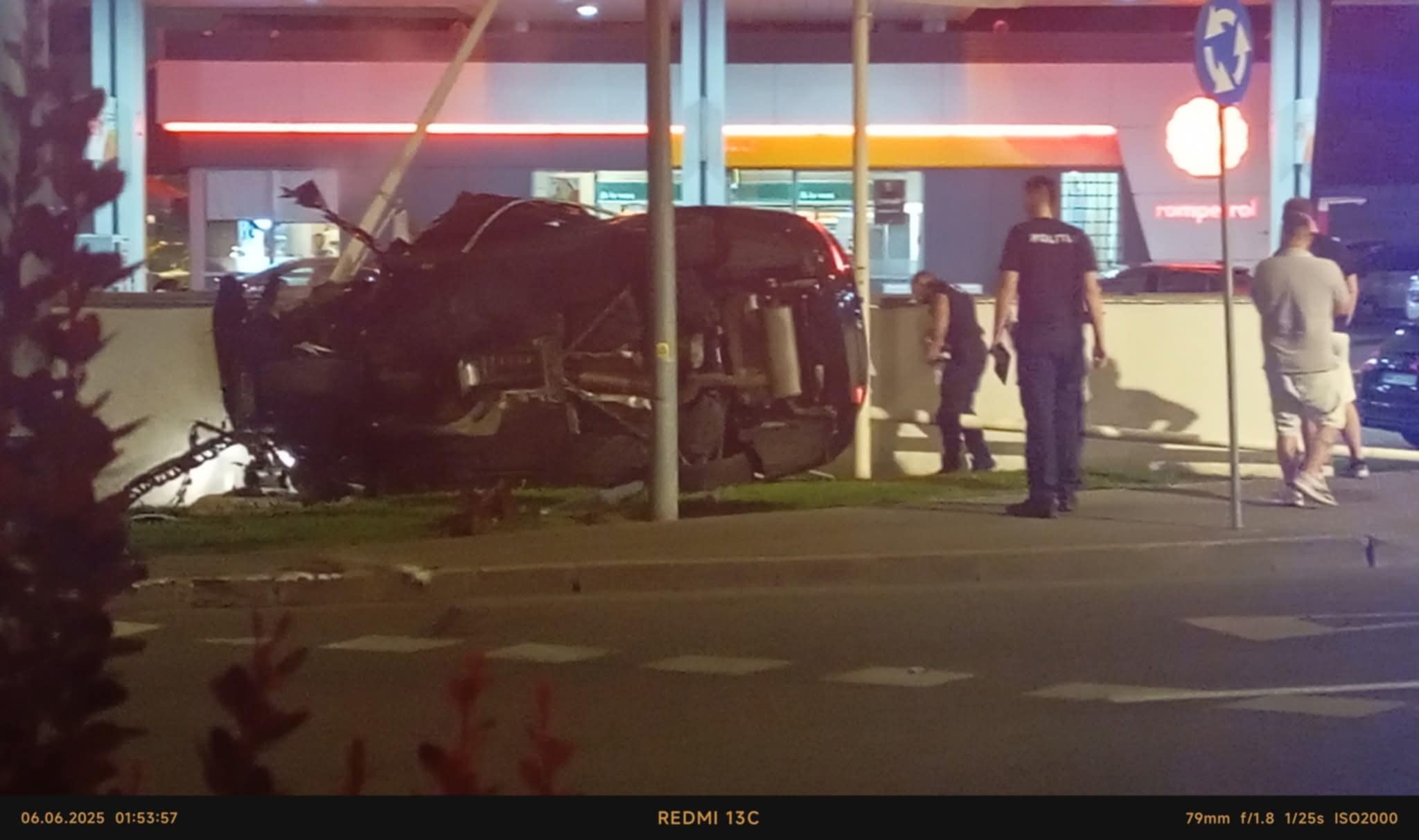 În urma impactului inițial, autoturismul s-ar fi răsturnat pe partea dreaptă, ar fi avariat alți trei stâlpi și s-ar fi oprit în zidul de beton al unei stații de alimentare cu carburanți. În incinta stației de alimentare a fost avariat și un autoturism parcat.