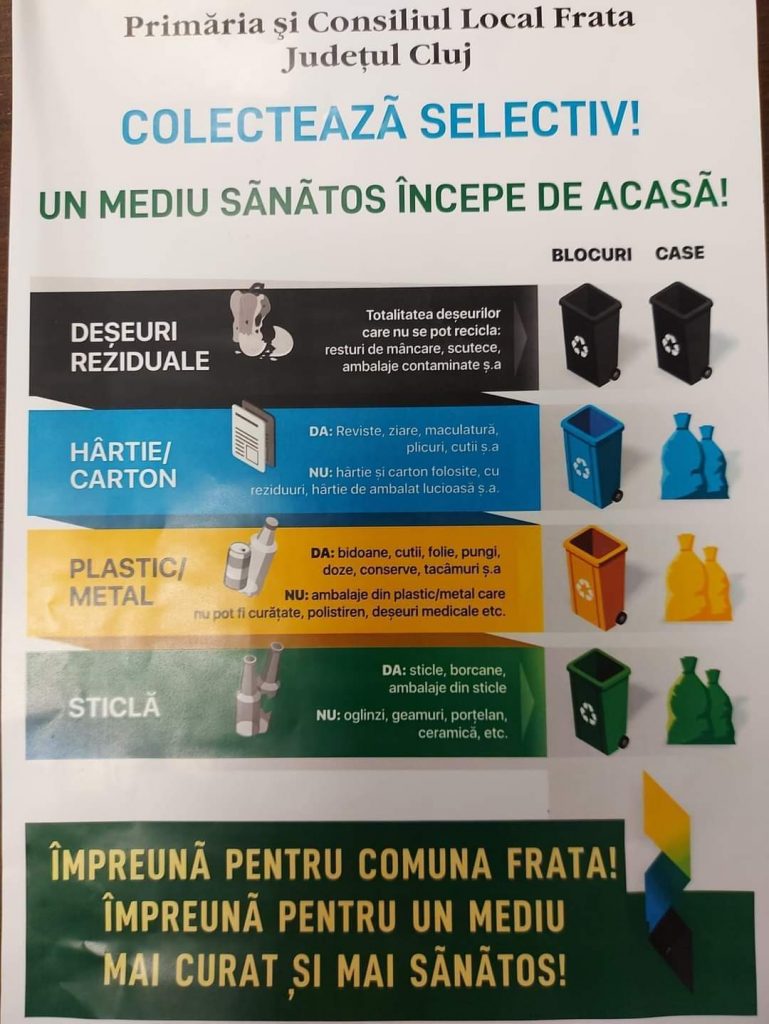 Conform Planului de Instruire Mediu pentru populaţia comunei Frata-anul 2021, PRIMĂRIA COMUNEI FRATA a informat şi sprijinit prin acţiuni de distribuire saci menajeri şi tomberoane.