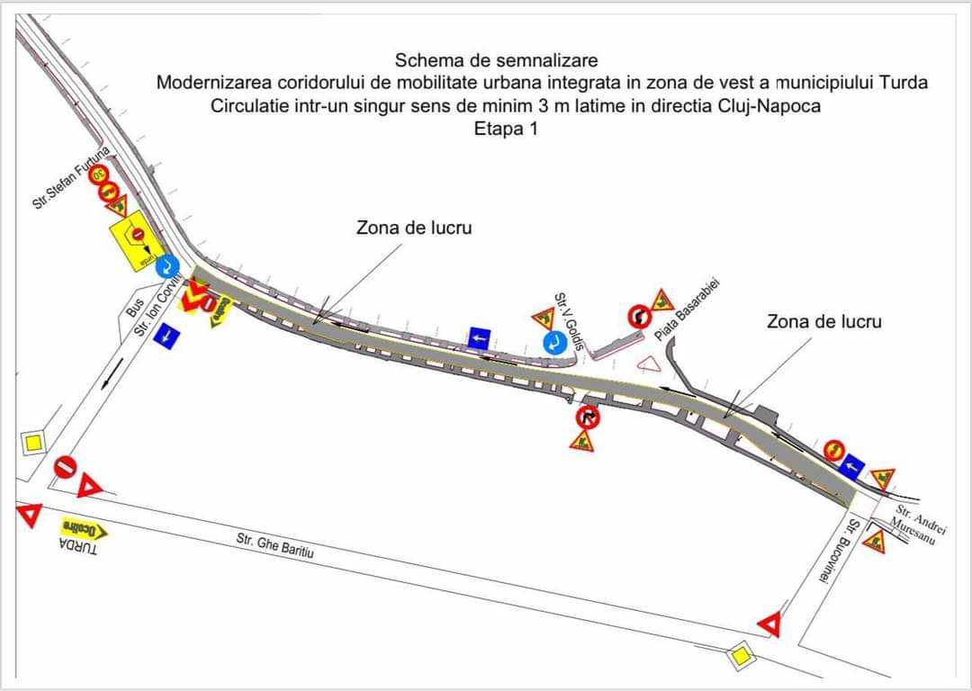 Circulația auto de la intrarea în Turda se va face pe strada Alexandru Ioan Cuza. Stația de autobuz de pe strada Clujului nr. 69 va fi mutată pe partea dreaptă, vizavi de intrarea la Dacia Service, pe drumul de legătură între strada Clujului și strada Alexandru Ioan Cuza.