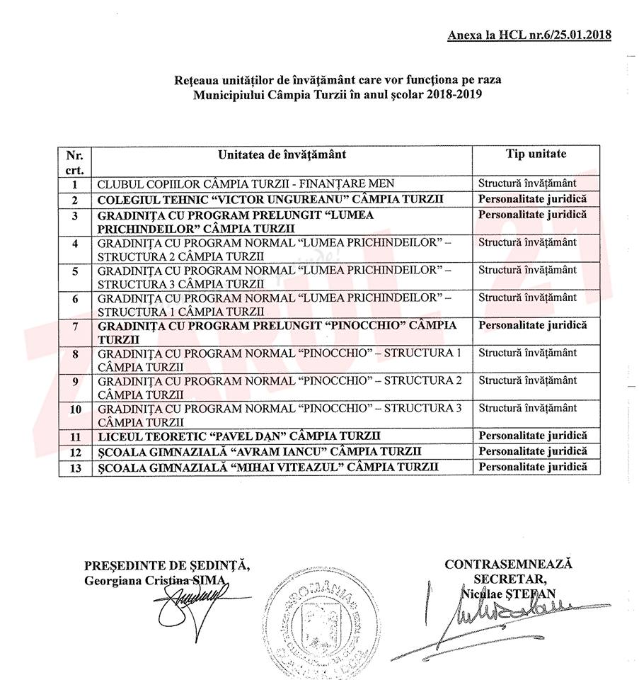 Consiliul Local al municipiului Câmpia Turzii a aprobat în prima lună 2018 rețeaua unităților de învățământ care vor funcționa pe raza municipiului Câmpia Turzii în anul școlar 2018-2019.