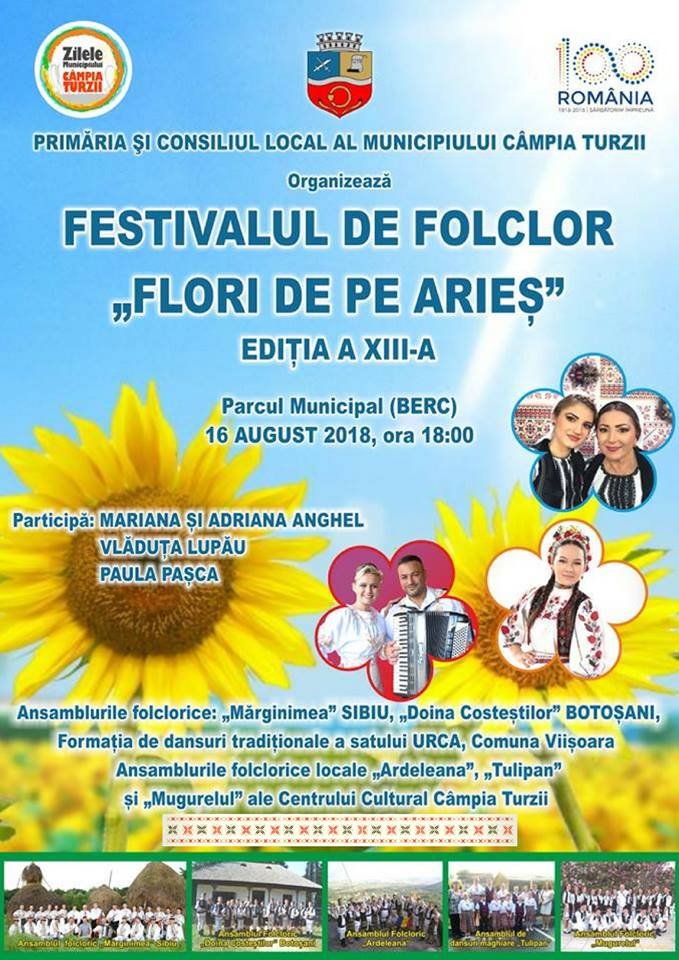 Din aceste considerente, administrația locală a Municipiului Câmpia Turzii organizează, în ziua de joi, 16 august 2018, cea de-a XIII-a ediție a festivalului folcloric “Flori de pe Arieş”, devenit un simbol al comunităţii noastre.