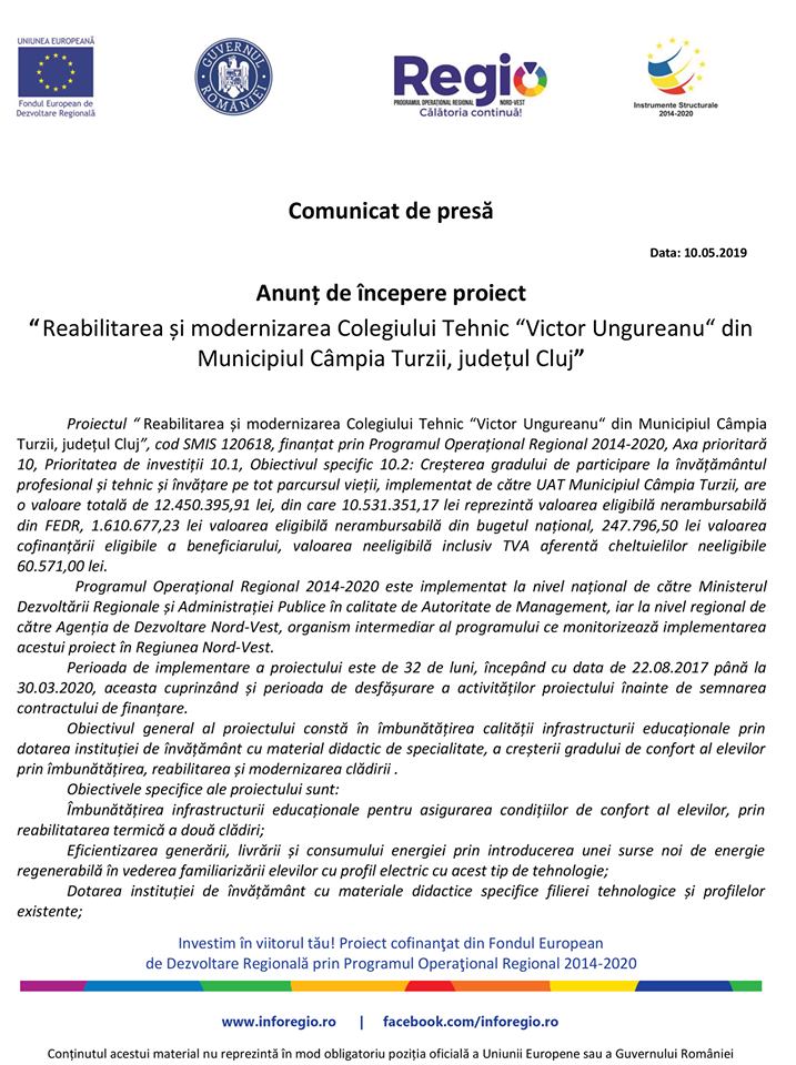 Administraţie Anunț de începere proiect “ Reabilitarea și modernizarea Colegiului Tehnic “Victor Ungureanu“ din Municipiul Câmpia Turzii, județul Cluj” ziarul21.ro 10 mai 2019, 15:08 Share Tweet Share Share Email Comments Related Items:campia turzii, colegiul tehnic victor ungureanu, Featured Share Tweet Share Share Email Recommended for you Festivitatea de premiere a Concursului județean ”TE IUBESC, ROMÂNIA MEA!”- ediția a II-a Informații noi cu privire la procedura de sterilizare și microcipare a câinilor cu stăpâni din rasa comună și metișii acestora ATENȚIE LA ȚURȚURI! Click to comment Leave a Reply Anulează răspunsulComentariile trebuie să respecte regulile de utilizare.Adresa ta de email nu va fi publicată. Câmpurile necesare sunt marcate cu *Comentariu * Nume * Email * Δ Acest site folosește Akismet pentru a reduce spamul. Află cum sunt procesate datele comentariilor tale.