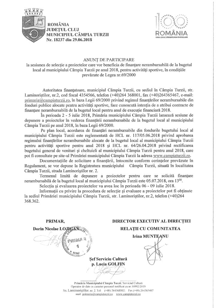 Administraţie Anunţ de participare la sesiunea de selecţie a proiectelor care vor beneficia de finanţare nerambursabilă de la bugetul local al municipiului Câmpia Turzii pe anul 2018, pentru activităţi sportive, în condiţiile prevăzute de Legea 69/2000 ziarul21.ro 29 iunie 2018, 19:54 Share Tweet Share Share Email Comments Related Items:Featured Share Tweet Share Share Email Recommended for you Tragedie feroviară: un tânăr de 21 de ani și-a pierdut viața Dansatorii Casei de Cultură Mihai Viteazu se întorc acoperiți de medalii de la Alba Iulia Salina Turda își așteaptă vizitatorii: experiență spectaculoasă în inima pământului Click to comment Leave a Reply Anulează răspunsulComentariile trebuie să respecte regulile de utilizare.Adresa ta de email nu va fi publicată. Câmpurile necesare sunt marcate cu *Comentariu * Nume * Email * Δ Acest site folosește Akismet pentru a reduce spamul. Află cum sunt procesate datele comentariilor tale.