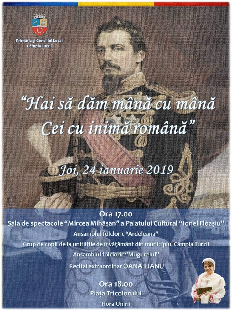 În amintirea acelor momente de amplă însemnătate națională, administrația locală a Municipiului Câmpia Turzii vă invită să luați parte la manifestările prilejuite de Ziua Unirii Principatelor Române.