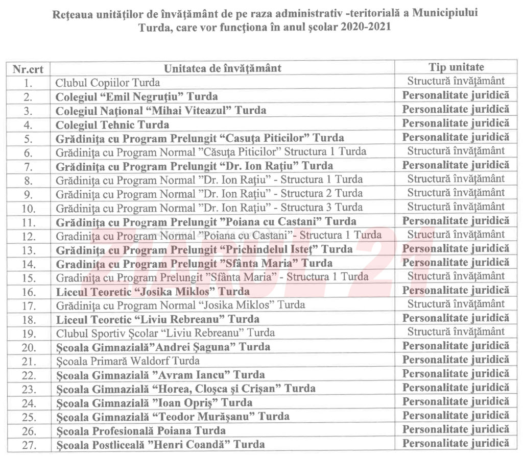 În baza avizului conform nr. 13917/26.11.2019, prin care s-a avizat de către Inspectoratul Şcolar Judeţean Cluj, unităţile de învăţământ preuniversitar de pe raza administrativ-teritorială a Municipiului Turda, pentru anul şcolar 2020-2021 și luând în considerare Ordinul nr. 5090/2019 pentru aprobarea Metodologiei privind fundamentarea cifrei de şcolarizare pentru învăţământul preuniversitar de stat, evidenţa efectivelor de preşcolari și elevi şcolarizaţi în unităţile de învăţământ particular, precum şi emiterea avizului conform în vederea organizării reţelei unităţilor de învăţământ preuniversitar pentru anul şcolar 2020 – 2021, unitățile de învățământ din Turda care au primit aprobare de funcționare sunt: