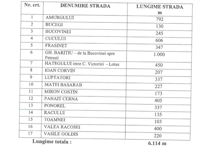 Cele 17 străzi care o să fie reabilitate sunt următoarele: Amurgului, Bucegi, Bucovinei, Cucului, Frăsinet, Gh. Barițiu (de la Bucovinei spre Petrești), Hațegului (între C.Victoriei – Lotus), Ioan Corvin, Matei Basarab, Miron Costin, Panait Cerna, Ponorel, Racului, Toamnei, Valea Racoșei, Vasile Goldiș.