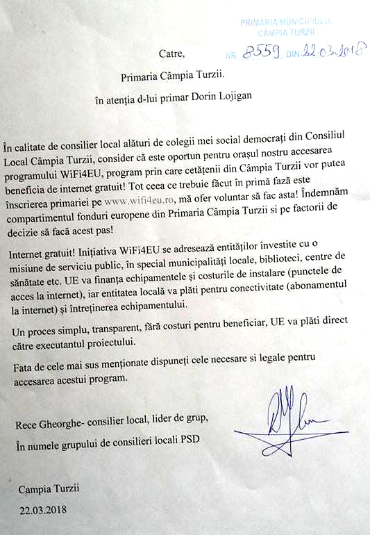 După ce, pe rețeaua de socializare facebook, au apărut mai multe știri care anunțau că s-a lansat marţi, de către Comisia Europeană, portalul web WiFi4EU, unde localităţile din toată Europa sunt invitate să se înregistreze în scopul de a obţine finanţare din partea Uniunii Europene pentru instituirea unor puncte de acces public şi gratuit la internet wireless, consilierul local PSD Câmpia Turzii a ieșit public propunând:” În calitate de consilier local,alături de colegii mei social democrați din Consiliul local Câmpia Turzii, consider că este oportun pentru orașul nostru accesarea programului WiFi4EU, program prin care cetățenii din Câmpia Turzii vor putea beneficia de internet gratuit! Tot ceea ce trebuie făcut în primă fază este înscrierea primăriei pe www.wifi4eu.ro. Mă ofer voluntar să fac asta! Îndemn compartimentul din Primaria Câmpia Turzii si pe factorii de decizie să facă acest pas!