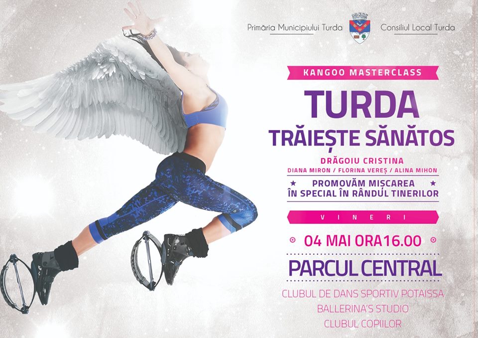 Vineri, în data de 04.05.2018, începând cu ora 16:00, în Parcul Central al Municipiului Turda, va avea loc un masterclass de kangoo jumps, susținut de instructorul Drăgoiu Cristina. Kangoo Jumps este un mod de a face mișcare foarte cunoscut, mai ales datorită numeroaselor beneficii asupra sănătății: protejează coloana vertebrală și articulațiile, stimulează sistemul limfatic și sistemul imunitar, corectează postura, întărește mușchii spatelui, îmbunătățește sistemul cardiovascular.