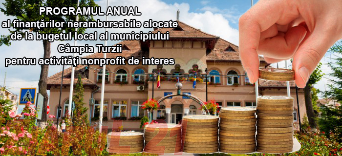 Autoritatea finanţatoare, municipiul Câmpia Turzii, cu sediul în Câmpia Turzii, str. Laminoriștilor, nr.2, telefon (+40)264-368.001, fax (+40)264-365.467, e-mail: primaria@campiaturzii.ro, face cunoscut Programul anual al finanţărilor nerambursabile de la bugetul propriu, pe anul 2019, pentru activităţi nonprofit de interes local pentru următoarele arii tematice, în condițiile prevăzute de Legea nr.350/2005, în valoare totală de 950.000 lei, astfel cum a fost aprobat prin Hotărârea Consiliului Local nr.71 din 21.05.2019 și conform disponibilităților bugetare aprobate prin Hotărârea Consiliului Local nr.57 din 23.04.2019 privind aprobarea Bugetului de Venituri și Cheltuieli al Municipiului Câmpia Turzii pentru anul 2019.