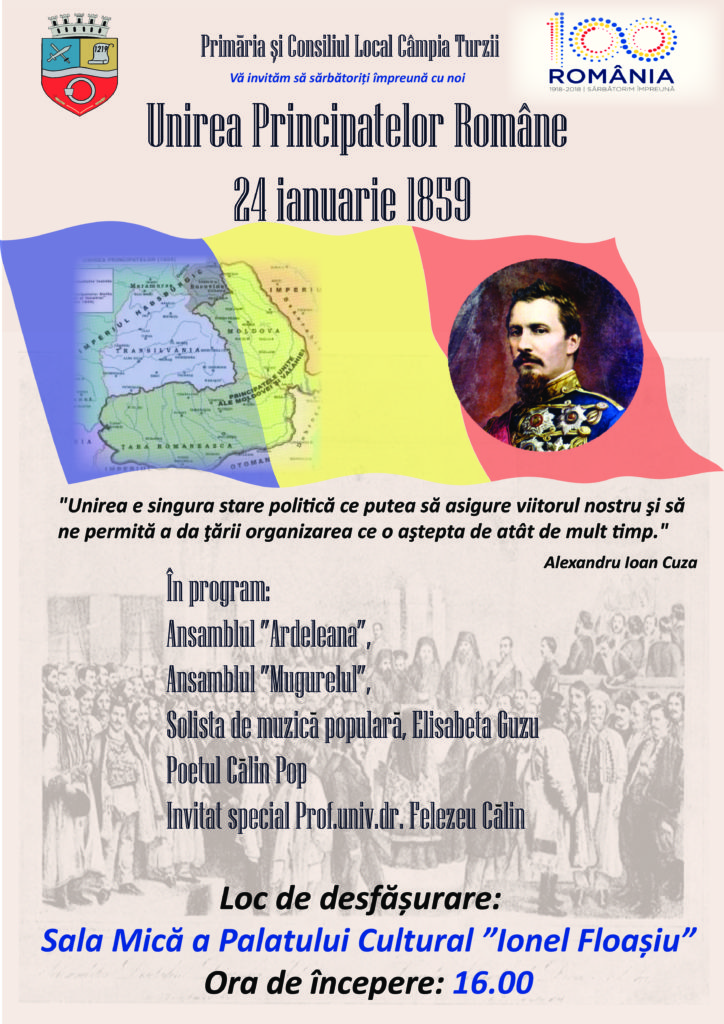 Primăria Municipiului Câmpia Turzii invită toți cetățenii, miercuri 24 ianuarie 2018, de la ora 16.00, la Palatul Cultural „Ionel Floașiu” – sala mică, pentru a sărbători împreună 159 de ani de la Unirea Principatelor Române.