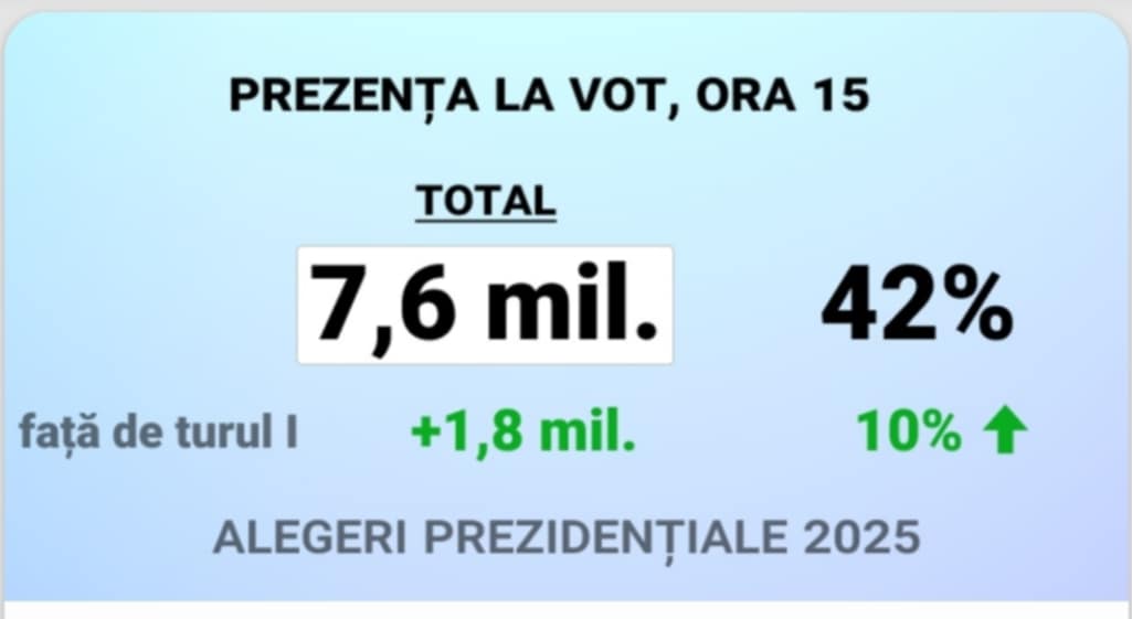 Au votat până acum 7,6 milioane de români, dintre care 1,2 milioane în afara țării. Asta înseamnă deja 1,8 milioane mai mult decât la primul tur, din 4 mai, când, la finalul zilei se votaseră 9,5 milioane de români. La ritmul actual, există o bună șansă ca prezența să depășească 11-11,5 milioane de alegători.