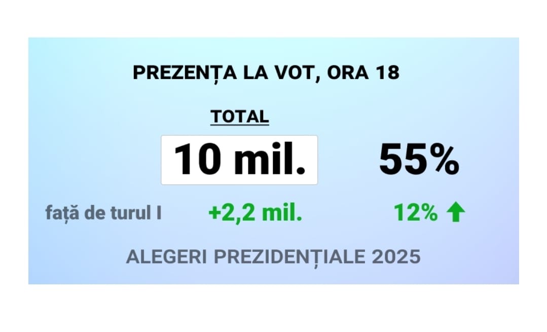 ora 18. Până la această oră au votat 10 milioane de români, dintre care 1,45 milioane în străinătate, reprezentând peste 55% dintre persoanele cu drept de vot. În țară, o prezență mai mare se înregistrează în mediul urban, unde au votat aproape 4,9 milioane, cu 1,2 milioane mai mult decât în mediul rural.