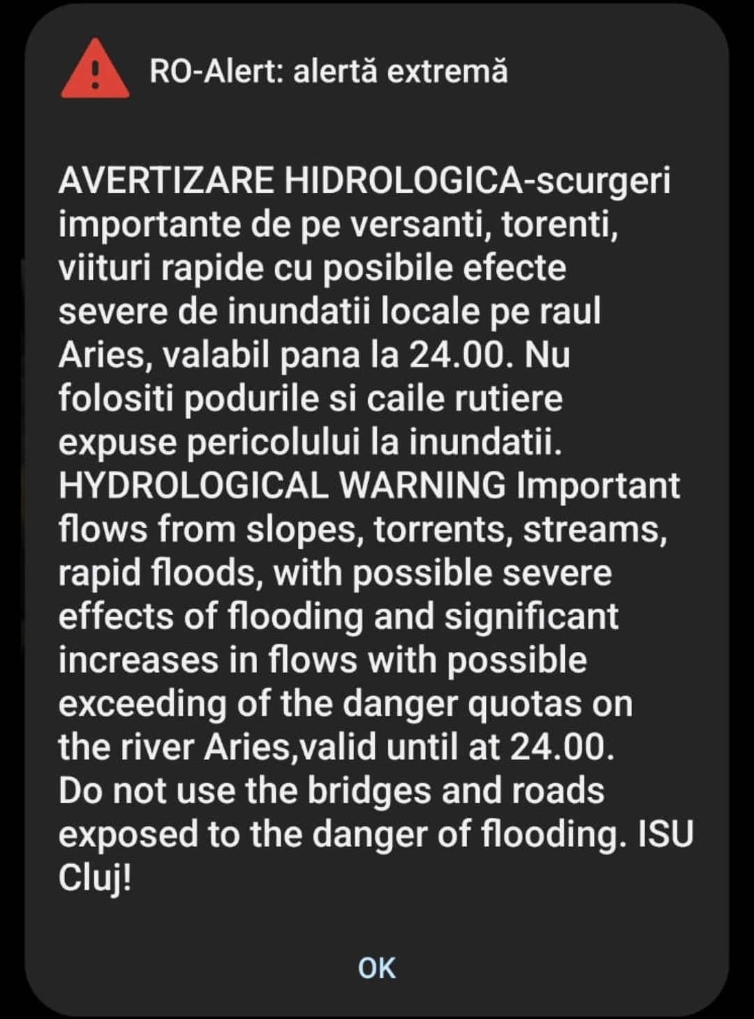 AVERTIZARE HIDROLOGICA-scurgeri importante de pe versanti, torenti, viituri rapide cu posibile efecte severe de inundatii locale pe raul Aries, valabil pana la 24.00. Nu folositi podurile si caile rutiere expuse pericolului la inundatii. HYDROLOGICAL WARNING Important flows from slopes, torrents, streams, rapid floods, with possible severe effects of flooding and significant increases in flows with possible exceeding of the danger quotas on the river Aries,valid until at 24.00. Do not use the bridges and roads exposed to the danger of flooding. ISU Cluj!