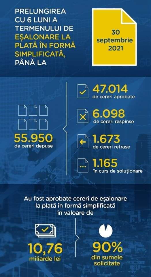 Până la data de 30 martie 2021 s-au depus 55.950 de cereri pentru suma totală de 11,95 mld. lei. Dintre acestea, 47.014 de cereri au fost aprobate, aferente sumei de 10,76 mld. lei (90% din sumele solicitate), 1.673 cereri au fost retrase de contribuabili, 6.098 au fost respinse din motive legale și 1.165 de cereri sunt în curs de soluționare.
