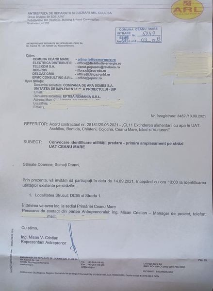 Primăria comunei Ceanu Mare a predat amplasamentul pe străzi ,constructorului ARL Cluj,pentru investiția de alimentare cu apă a localității Strucut