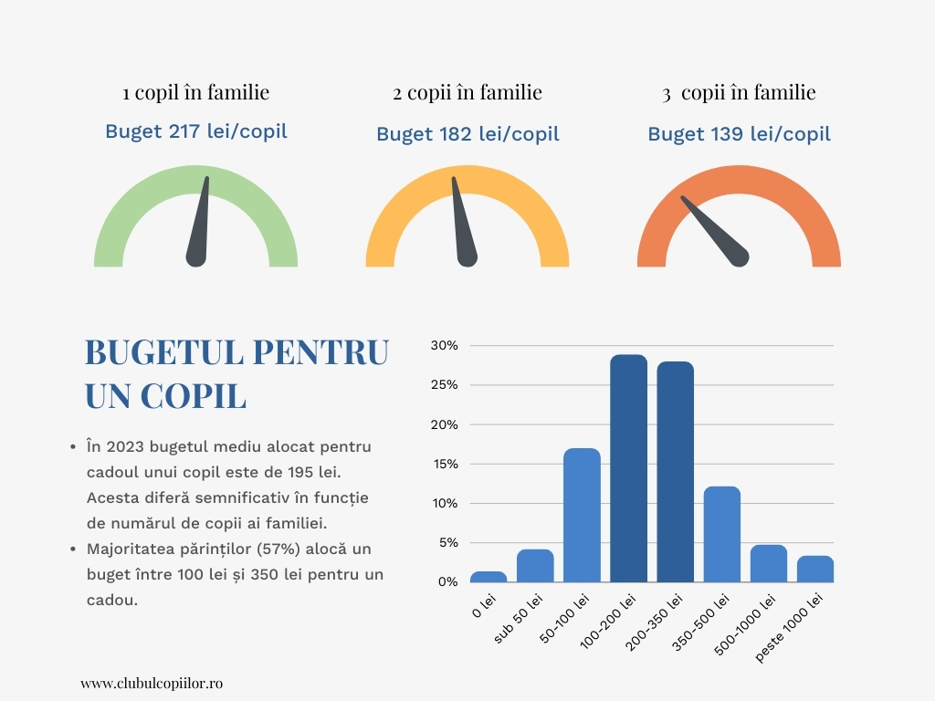 - Bugetul mediu per copil diferă semnificativ în funcție de numărul de copii ai familiei. Familiile cu un singur copil cheltuie pe cadouri în medie 217 lei per copil, față de 182 de lei per copil pentru cei cu doi copii și 137 per copil pentru cei cu 3 copii;