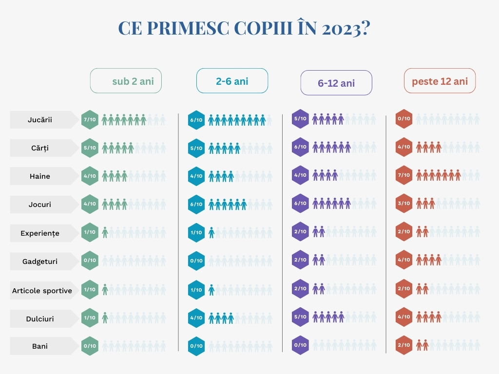 Se observă o evoluție a preferințelor în funcție de vârstă, cu o trecere de la jucării și jocuri la gadgeturi electronice, activități sau experiențe și articole sportive odată cu creșterea copiilor în vârstă. Cărțile se mențin în topul preferințelor, 6 din 10 părinți alegând să ofere cărți copiilor în grupa de vârstă 6-12 ani.