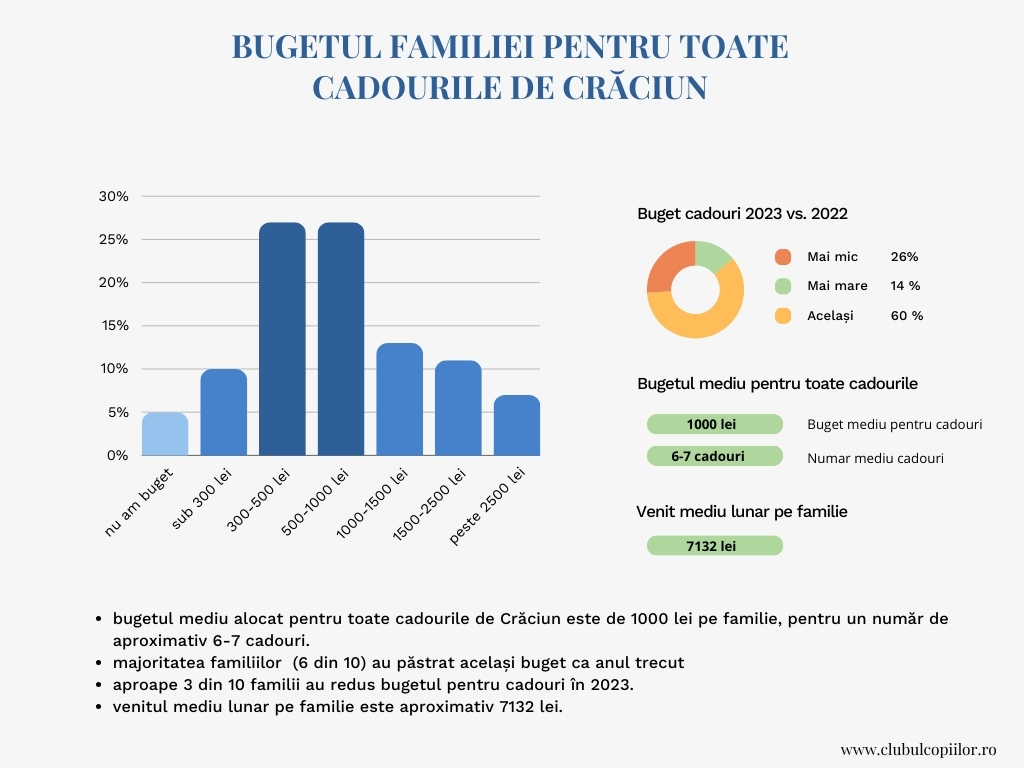 Bugetul mediu alocat pentru toate cadourile de Crăciun se situează în jurul valorii de 1000 de lei pe familie, pentru un număr de aproximativ 6-7 cadouri.
