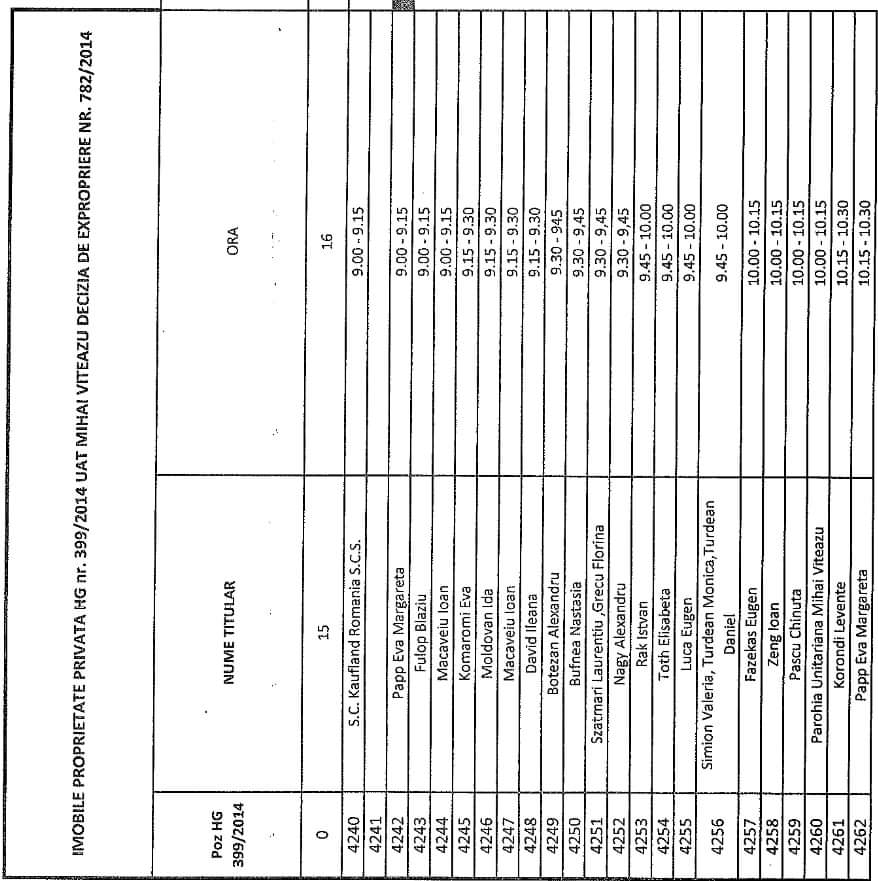 Vă informăm că în perioada de 19.03.2021, între orele 09.00 si 16.00, persoanele deţinătoare cu orice titlu ale imobilelor expropriate în baza H.G.nr. 399/2014, identificate conform anexei la prezenta, sunt convocate să se prezinte la SALA DE EVENIMENTE din sediul PRIMARIEI MIHAI VITEAZU,str. Principală,nr. 1014 Loc. MIHAI VITEAZU.
