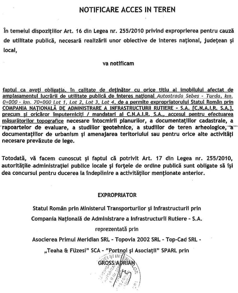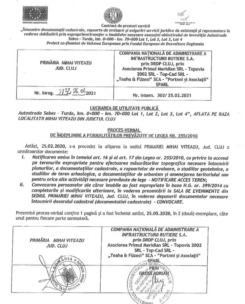 Statul Român prin Ministerul Transporturilor şi Infrastructurii prin Compania Natională de Administrare a Infrastructurii Rutiere – S.A. reprezentată prin Asocierea Primul Meridian SRL – Topovia 2002 SRL – Top-Cad SRL – „Teaha & Fuzesi” SCA „Portnoi si Asociatii” SPARL prin Gross Adrian.”