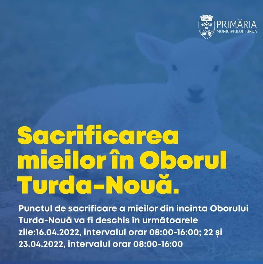 Pentru persoanele interesate, punctul de sacrificare a mieilor din incinta Oborului Turda-Nouă, cu intrare de pe strada Alexandru Ioan Cuza, va fi deschis în perioada premergătoare sărbătorilor Pascale 2022, astfel: