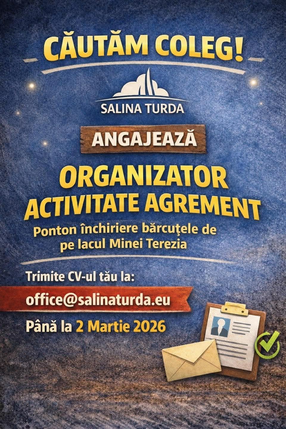 Candidații interesați pot trimite CV-ul la: office@salinaturda.eu sau îl pot depune la sediul societății din Turda, Aleea Durgăului nr. 7, până la data de 2 Martie 2026.