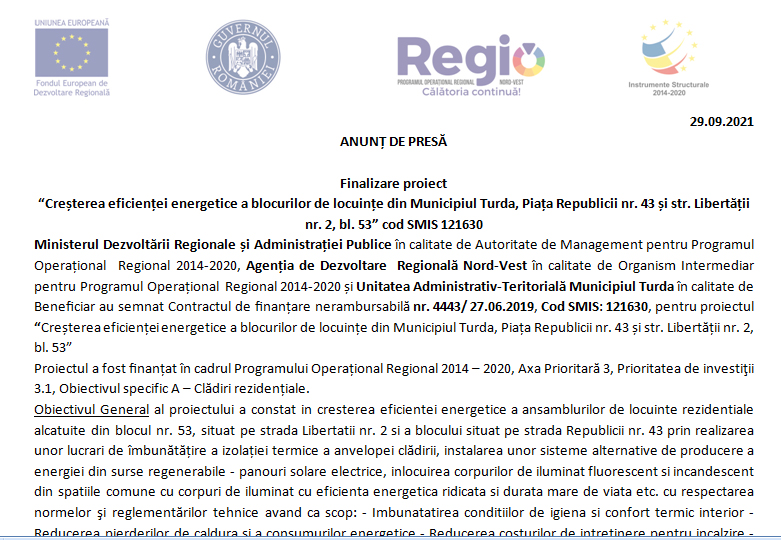 Ministerul Dezvoltării Regionale și Administrației Publice în calitate de Autoritate de Management pentru Programul Operațional Regional 2014-2020, Agenția de Dezvoltare Regională Nord-Vest în calitate de Organism Intermediar pentru Programul Operațional Regional 2014-2020 și Unitatea Administrativ-Teritorială Municipiul Turda în calitate de Beneficiar au semnat Contractul de finanțare nerambursabilă nr. 4443/ 27.06.2019, Cod SMIS: 121630, pentru proiectul “Creșterea eficienței energetice a blocurilor de locuințe din Municipiul Turda, Piața Republicii nr. 43 și str. Libertății nr. 2, bl. 53”
