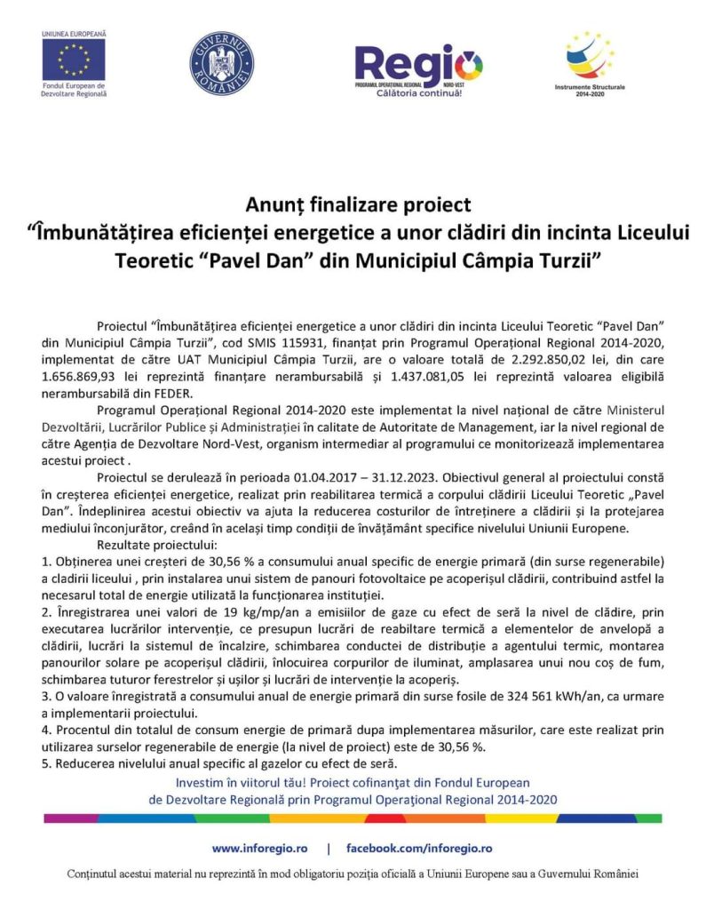 Proiectul “Îmbunătățirea eficienței energetice a unor clădiri din incinta Liceului Teoretic “Pavel Dan” din Municipiul Câmpia Turzii”, cod SMIS 115931, finanțat prin Programul Operațional Regional 2014-2020, implementat de către UAT Municipiul Câmpia Turzii, are o valoare totală de 2.292.850,02 lei, din care 1.656.869,93 lei reprezintă finanțare nerambursabilă și 1.437.081,05 lei reprezintă valoarea eligibilă nerambursabilă din FEDER.