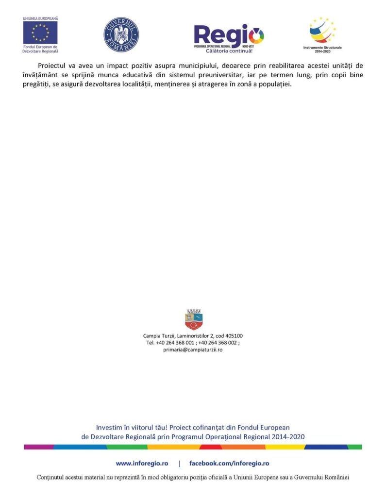 Proiectul va avea un impact pozitiv asupra municipiului, deoarece prin reabilitarea acestei unități de învățământ se sprijină munca educativă din sistemul preuniversitar, iar pe termen lung, prin copii bine pregătiți, se asigură dezvoltarea localității, menținerea și atragerea în zonă a populației.