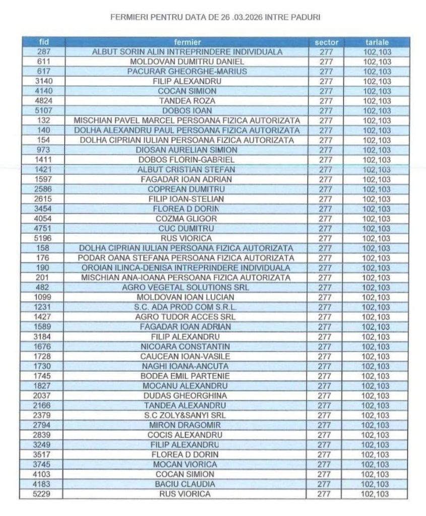 Primăria Comunei Ceanu Mare aduce la cunoștința cetățenilor care dețin teren în tarlaua Între Păduri și care își regăsesc numele în tabelul anexat, că sunt invitați: