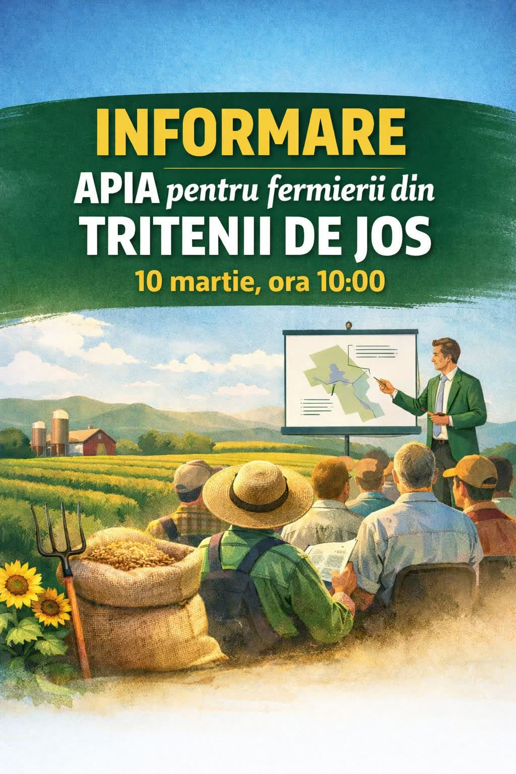 Primăria Comunei Tritenii de Jos informează toți producătorii agricoli de pe raza comunei cu privire la organizarea unei sesiuni de consultanță oferite de APIA – Centrul Județean Cluj.