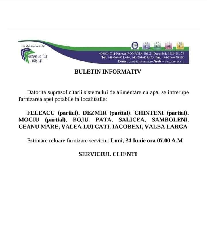 Compania de Apă Someș anunță întreruperea furnizării apei potabile până Luni 24.06.2024..